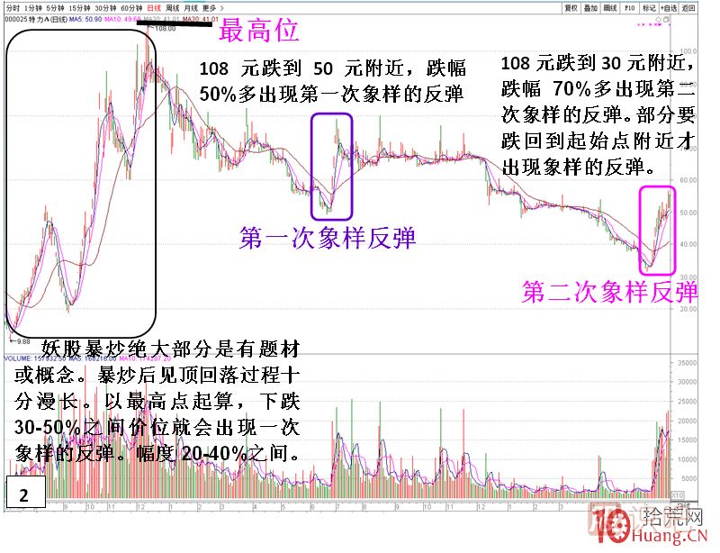 帶有題材概念被暴炒的妖股在見頂回落漫長下跌中,往往會出現兩至三次明顯的成規(guī)模的反彈。反彈有一共同特征“以連續(xù)大陽漲停反抽拉出兩至四個漲停板”。 規(guī)模明顯的反彈完全是妖股一副陰魂不散的表現。這種妖股陰魂不散的因為在前期