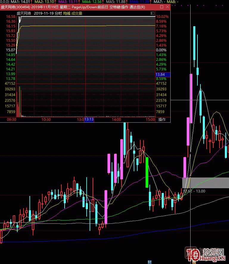 再比如19年11月19日的盛天網(wǎng)絡(luò) ,是標(biāo)準(zhǔn)的盤中弱轉(zhuǎn)強,開盤低開之后,迅速翻紅,分時流暢漲停。