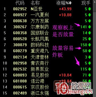 左二,市場漲跌幅排名,后面跟了一個<現(xiàn)手>功能(成交量)。注意了,這個功能很有用,漲幅排名和現(xiàn)手功能組合,盤中盯著現(xiàn)手,成交量突然放大就是板上放量了,能提前知道有沒有炸板跡象。