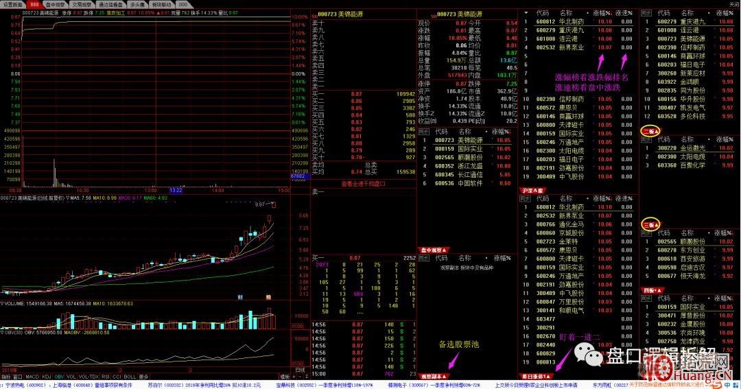 【漲幅+先手】,這個可以用來觀察漲停板的潛在炸板股,如果板上放量,就容易炸板了。(將鼠標(biāo)放在窗口中間,然后左右移動鍵盤的”←“,“→”就可以)