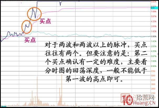不過事物都是兩面性的,雖然該股多出了一個買點,但是其“確認(rèn)”漲停的難度也加大了。這里有一個最低標(biāo)準(zhǔn),就是第二波的脈沖回蕩的低點不能低于第一波脈沖的高點 ,第三波脈沖不能低于第二波脈沖的高點,否則這種脈沖就是無效的,后面很可能演化成沖高回落的走勢,請切記!