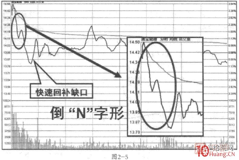 三是在向下的過程中有一次反抽,但是其反抽的高度極其有限,一般不會超過開始下跌長度的二分之一就會迅速回落,從而形成一個倒“N”形走勢。