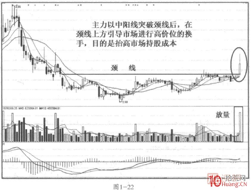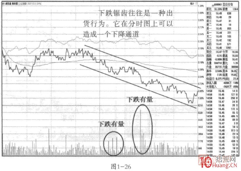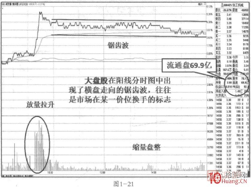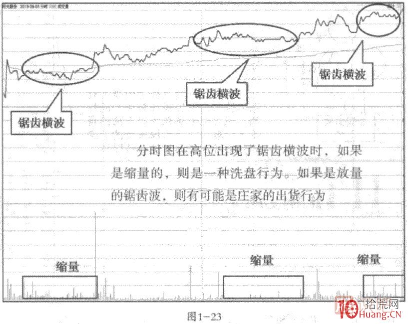 注意,這種橫盤的鋸齒波如果在分時(shí)圖的相對(duì)高位出現(xiàn)了縮量走勢(shì),是一種典型的洗盤行為,洗盤完畢后還有一沖。而如果是放量的橫盤,則可能是主力的出貨行為,要引起高度警惕。見圖1-23.