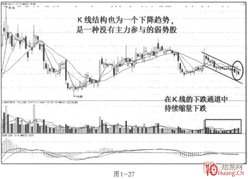 還有一點(diǎn)也是非常明確的,就是當(dāng)一只股票在相對(duì)的高位先出現(xiàn)一根大陽線,之后便是縮量的下跌狀態(tài)的鋸齒波時(shí),那肯定是主力在出貨。見圖1-26和圖1-27.