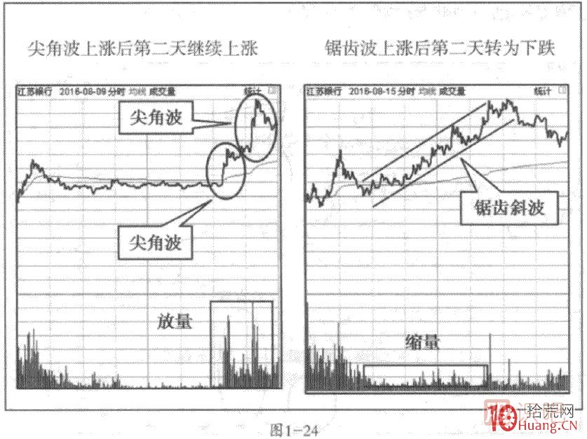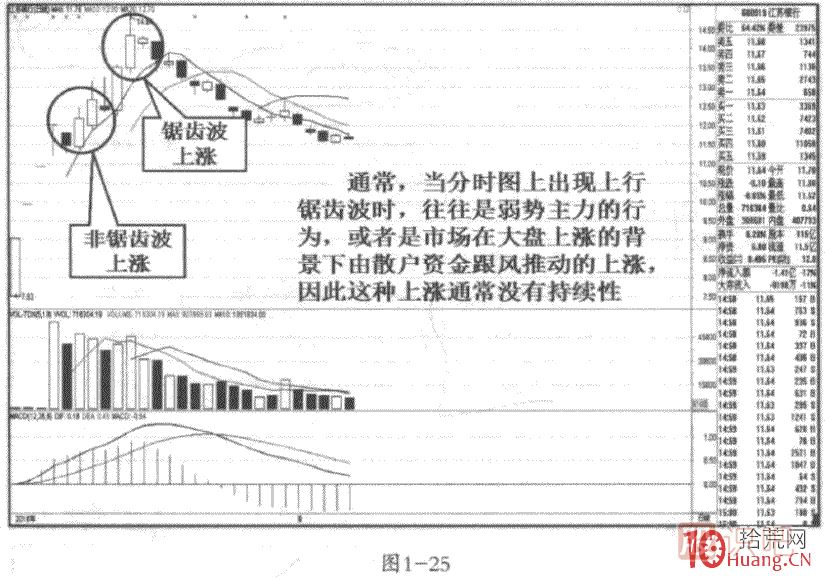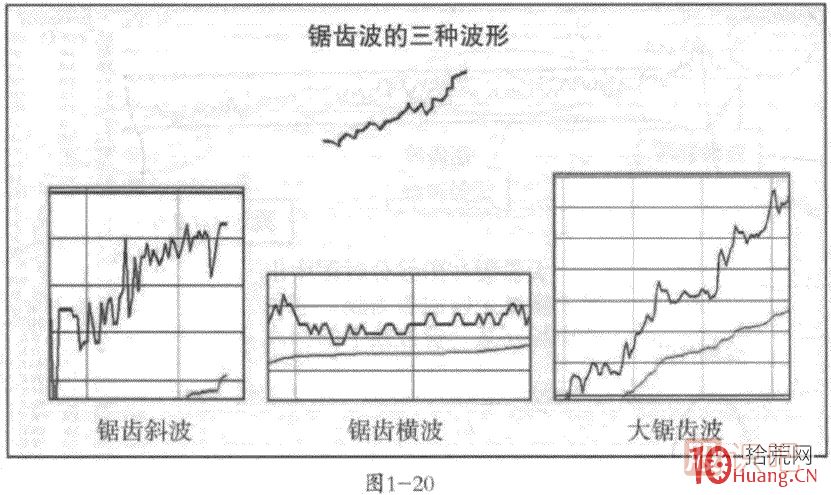 所謂鋸齒波,顧名思義,就是無論是上漲還是下跌的分時(shí)圖上,都是呈現(xiàn)出一種類似“鋸齒”狀態(tài)的走勢(shì),也就是說股價(jià)在微幅波動(dòng)下的單邊上漲和單邊下跌和橫盤走勢(shì)中(見圖1-12中右一圖所示),