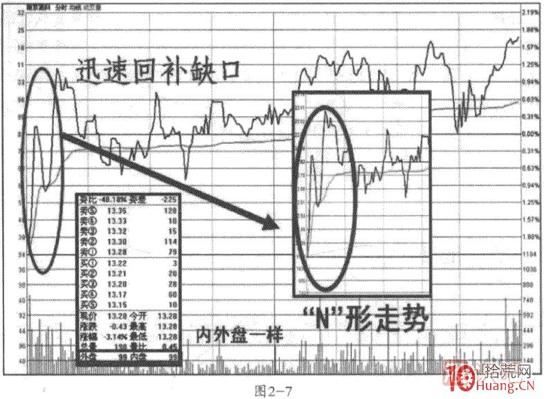所謂洗盤上攻,即低開后股價(jià)快速上沖到缺口附近,稍有回落后又快速上攻以回補(bǔ)缺口,在分時(shí)圖上也呈現(xiàn)一個(gè)“N”形或“W”形走勢(shì)。這說明低開是為了嚇出獲利盤和套牢盤,當(dāng)拋盤被買消化后股價(jià)就開始回到紅盤區(qū),顯示多頭力道強(qiáng)大,當(dāng)日自然看漲。請(qǐng)看圖2-7和圖2-8.