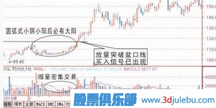 圓弧形態(tài)一般出現(xiàn)在調整后或者橫盤整理挖坑后走出的圖形,從技術形態(tài)上看有二個特別現(xiàn)象是,一個是在圓弧底位會出現(xiàn)密集交易區(qū),(密集交易就是說持續(xù)幾天的K線長短差不多),二是均量萎縮,但是陽線是有帶量的,陰線非常縮量。但在圓弧快形成階段量能會逐步放大,這個階段為初步買入信號出現(xiàn),一旦放量突破前弧口處為黃金介入點,如果你錯過這一點位,那么一般突破后都會有一個回落過程,當然回落不破支撐線可再一次介入信號出現(xiàn)。如果這一次買入信號錯過你必將后悔,因為后面少有機會介入了,不管后市怎么調整也難回到前面這個價位。一般出現(xiàn)類似圓弧圖形的,在后期都會走一大波行情出來,圓弧越大,主力吸籌越多,后市走向越高。