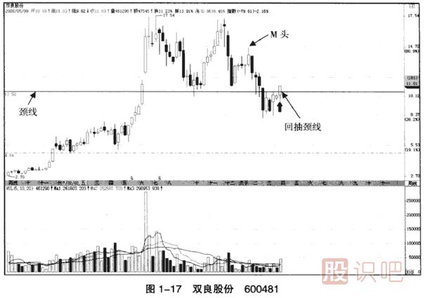 (3)2008年5月9日,大長(zhǎng)陽(yáng)突破頸線(圖中實(shí)線),只是對(duì)頸線進(jìn)行回抽,屬于賣出信號(hào)。