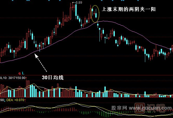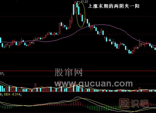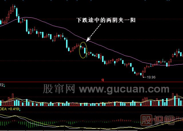 當(dāng)兩陰夾一陽(yáng)出現(xiàn)在下以趨勢(shì)中時(shí),對(duì)股價(jià)有助跌的作用,表示后市繼續(xù)看跌。