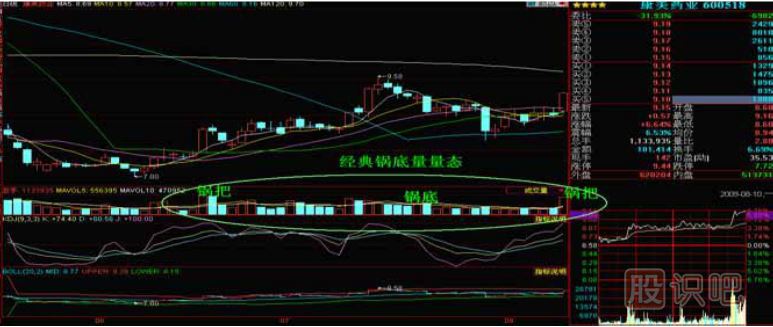 技術(shù)特征:鍋底量,是指在底部區(qū)域的平臺(tái)整理過(guò)程中,股價(jià)窄幅震蕩整理,暫時(shí)沒(méi)有明確方向時(shí),成交量漸漸縮減,然后再漸漸增溫的變化,整個(gè)成交量的形態(tài)好像一個(gè)較淺的鍋底形態(tài),這種特殊的情形,稱為鍋底量。