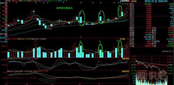 技術(shù)特征:試盤量經(jīng)典量態(tài),試盤量發(fā)生在兩個(gè)位置,一處為循環(huán)低位區(qū),股價(jià)為準(zhǔn)備上漲前的暖身運(yùn)動(dòng),稱為低位試盤量;另一處發(fā)生在股價(jià)漲升一段時(shí)間之后,股價(jià)處于高位整理軋尚未明顯走弱,呈現(xiàn)成交量能逐漸增加現(xiàn)象,稱為高位試單量。試盤量發(fā)生之后往往伴隨攻擊型量能的啟動(dòng)。正如:小荷才露尖尖角的試盤量發(fā)生后,隨后攻擊量的到來,必將催生股價(jià)映日荷花別樣紅。下面討論低位試盤量。發(fā)生在2次試盤量之后常為變盤點(diǎn)。試盤量如下圖國際實(shí)業(yè)(000159)標(biāo)示A、B、C處。