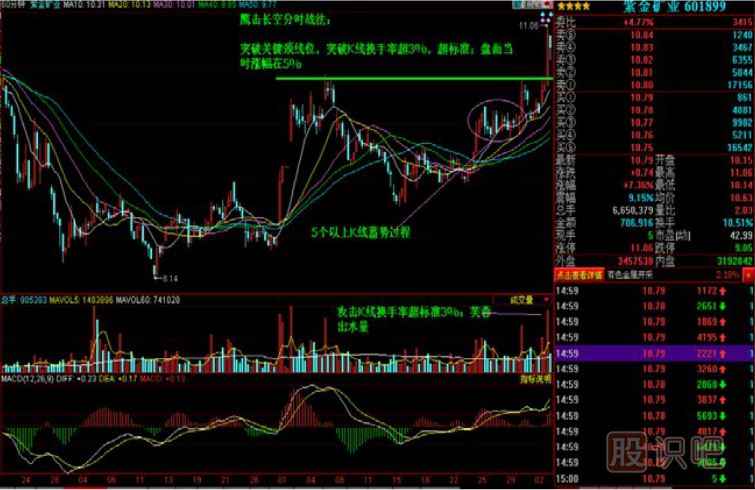 4、60分鐘K線明顯帶巨量上漲并突破重要技術(shù)位,增加有效性;突破型K線換手率達(dá)3%以上,換手越大越好。