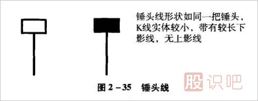 1.錘頭線形似“錘子”,無上影線,有下影線,在下跌過程中出現(xiàn),一般是見底的信號。