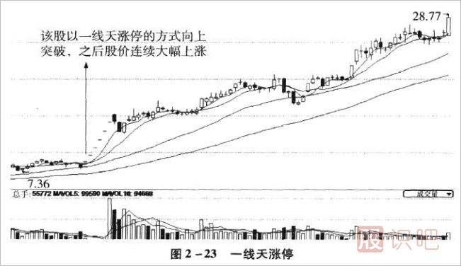 “一線天”是筆者自己起的名字。這種K線被公眾稱為“一字線”,即K線是一根橫線,沒有上下影線,開盤價(jià)即收盤價(jià),K線圖形就像我們平時(shí)所寫的漢字“一”,故而叫一字線K線,如同2-22所示。