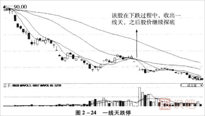 如果一線天為跌停,且出現(xiàn)在下跌過程中,則要非常謹(jǐn)慎,后市可能繼續(xù)連續(xù)一線天跌停,投資者不可急于買入,如圖2-24所示。