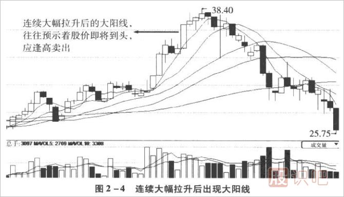 如果股價(jià)在連續(xù)大幅上揚(yáng)之后收出大陽(yáng)線,則不能單純地預(yù)測(cè)股價(jià)將上揚(yáng),因?yàn)?a href=http://pontderentat.com/GPRM/zs/3692.html target=_blank class=infotextkey>主力需要出貨的時(shí)候往往會(huì)做出好看的圖形,此時(shí)股價(jià)見(jiàn)頂回落的概率較大,投資者不可盲目追高,持有者應(yīng)當(dāng)進(jìn)行減倉(cāng)操作。如圖2-4所示