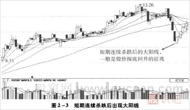 如果在股價(jià)連續(xù)下跌之后出現(xiàn)大陽(yáng)線,則表明多方將組織反攻,買(mǎi)方從下方向上掃貨,空方由于連續(xù)殺跌,失去了繼續(xù)做空的動(dòng)能,因此,股價(jià)將見(jiàn)底回升,逐步走高,此時(shí)投資者可適當(dāng)進(jìn)行抄底。如圖2-3所示