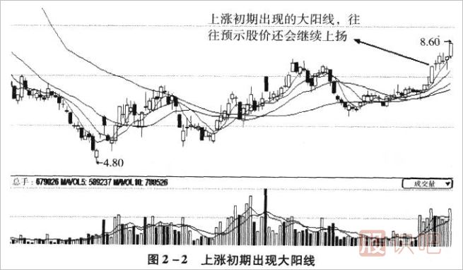 光頭光腳陽(yáng)線出現(xiàn)后,股價(jià)不一定繼續(xù)上漲,需要看這一K線出現(xiàn)在股價(jià)運(yùn)行的哪個(gè)區(qū)域。根據(jù)筆者長(zhǎng)期的經(jīng)驗(yàn)判斷,如果股價(jià)在上漲初期出現(xiàn)大陽(yáng)線,表明多頭力量強(qiáng)勁,股價(jià)仍會(huì)繼續(xù)上揚(yáng),投資者應(yīng)以持有為主,甚至可進(jìn)行適當(dāng)加倉(cāng)操作,如圖2-2所示。