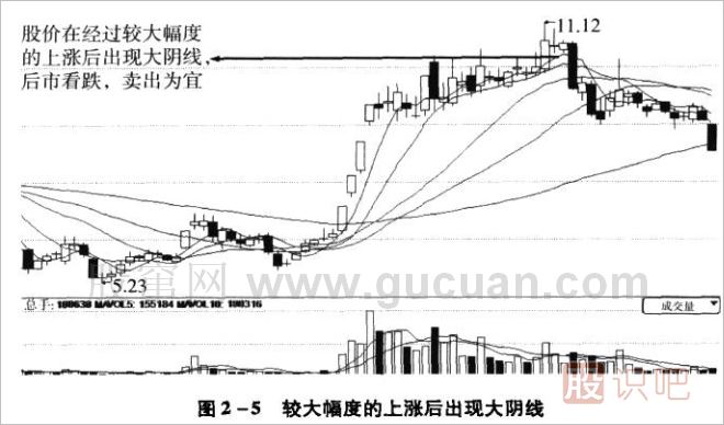 光頭光腳大陰線出現(xiàn)之后股價(jià)不一定繼續(xù)下跌,需要看這一K線出現(xiàn)在股價(jià)運(yùn)行的哪個(gè)區(qū)域。如果光頭光腳陰線出現(xiàn)在股價(jià)上漲一段時(shí)間之后,往往是空方開(kāi)始反擊的時(shí)候,投資者最好進(jìn)行減倉(cāng)操作。如圖2-5所示