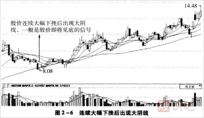 如果大陰線出現(xiàn)在股價(jià)連續(xù)大幅下跌之后,則往往是空方力量衰竭的表現(xiàn),此時(shí)投資就不宜跟風(fēng)殺跌,而應(yīng)該敢于逢低買(mǎi)入。但由于股票趨勢(shì)短期難以扭轉(zhuǎn),此操作方法只適宜短線操作,獲利就拋,否則可能先賺后賠再次被套。如圖2-6所示