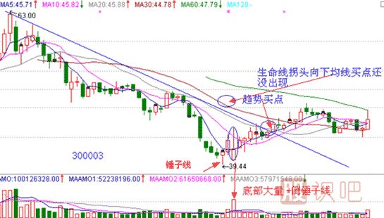 300003,樂普醫(yī)療,2010年1月28日出現(xiàn)了金針探底的特殊形式錘子線,隨后第三天2月1日就是我們傳說中的倒錘子線,而且伴有底部大量出現(xiàn),金針探底+倒錘子線組合是我研究中的必漲組合,由于底部大量的出現(xiàn),當(dāng)日實(shí)盤講解時(shí)就斷定此底部形態(tài)成立,后期越過阻擋線出現(xiàn)了趨勢買點(diǎn),但生命線拐頭現(xiàn)在仍然向下,決策線壓制股價(jià)明顯,穩(wěn)健投資者仍然需要耐心等待。