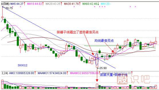 300012,華測檢測,日線圖,2010年2月1日出現(xiàn)了倒錘子線底部形態(tài),而且伴隨有底部巨額成交量,更讓人振奮的是此倒錘子線一舉突破阻擋線砸出了趨勢最佳買點(diǎn),隨后幾天又出現(xiàn)了均線最佳買點(diǎn),股票緩步盤升。