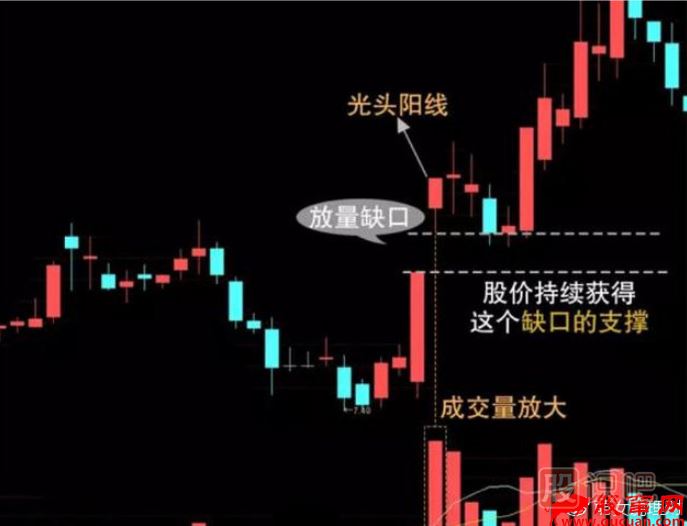 5、缺口處如伴隨著較大的成交量,在此間形成的支撐和阻力也越強(qiáng);