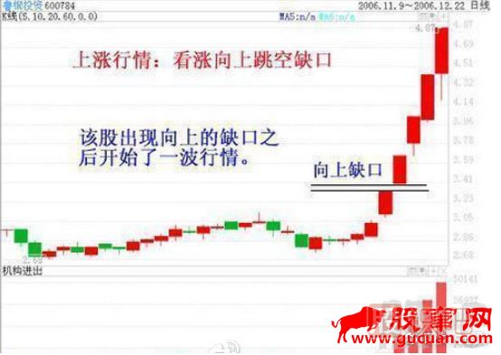 在上漲行情中如果出現(xiàn)了一個(gè)向上缺口,則意味著價(jià)格將進(jìn)一步上升。