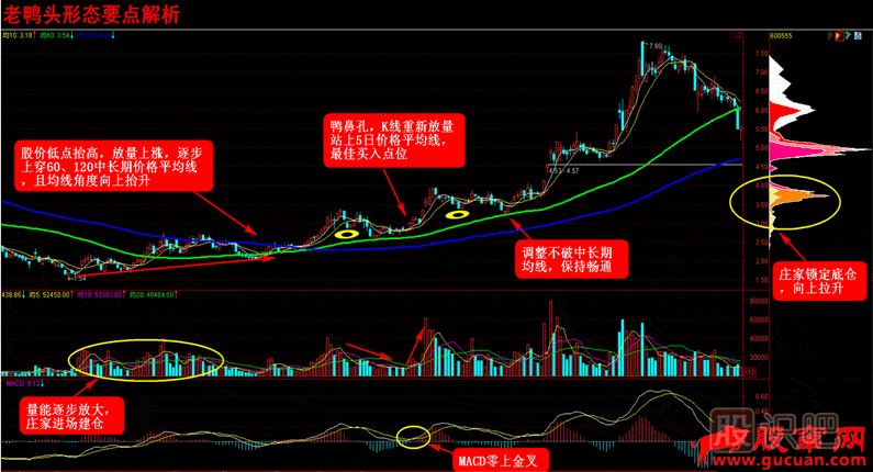 在波浪式推進黑馬形態(tài)中,股價經常在一波上漲后,進行短暫的調整,且當調整到重要價格平均線(20日、30日、60日等,在這里以60日價格平均線為準)附近再次起漲,重新開始新的一浪,并不斷的重復著這樣一個輪回,這種形態(tài)就是平時我們所說的波峰與波谷。而這種形態(tài)恰似生活中鴨子的頭部,故命名為老鴨頭形態(tài)。老鴨頭形態(tài)是牛市中最常見的推進形態(tài)。