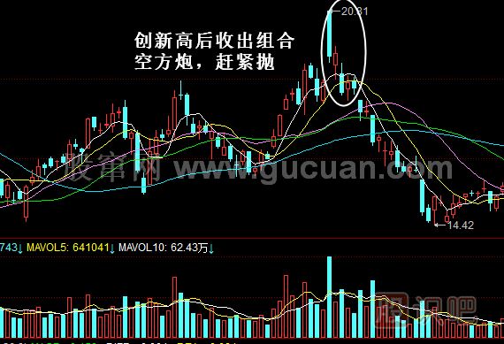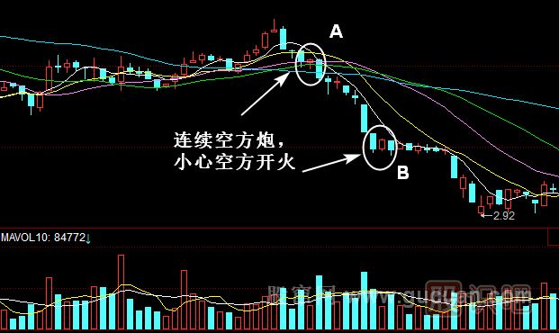 空方炮圖形往往是股價(jià)下跌的征兆,顧名思義,此圖形預(yù)示著空方將開火,投資者要盡快躲避,要不然將會(huì)被空方的炮彈擊個(gè)粉身碎骨。因此,遇到空方炮時(shí),投資者一定要非常小心。