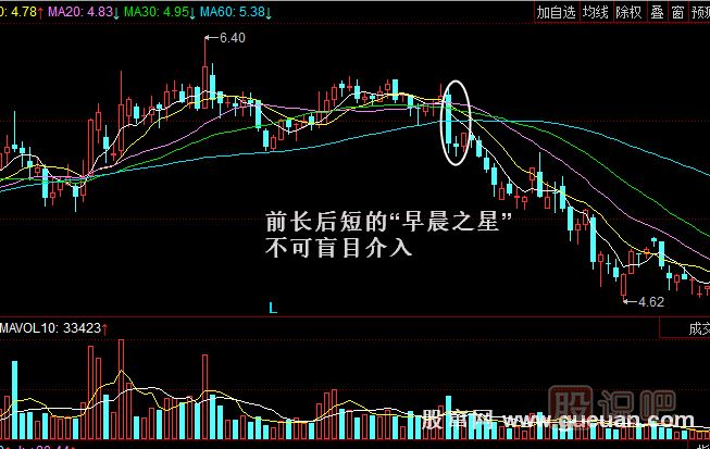 4.早晨之星出現(xiàn)在大幅下跌之后,見底信號更可靠,高位出現(xiàn)時不可盲目介入。