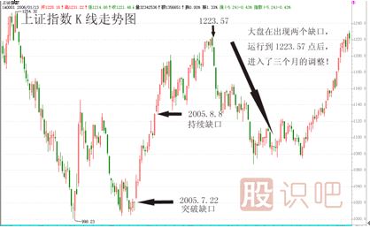 如:2005年從1004點(diǎn)啟動(dòng)的第一波行情中,7月22日出現(xiàn)了向上突破缺口,8月8日出現(xiàn)了持續(xù)缺口,這兩個(gè)缺口之間的距離是105點(diǎn)(1131點(diǎn)減去1026點(diǎn))(注:缺口的計(jì)算均以開盤價(jià)為準(zhǔn),因?yàn)槿笨诘男纬删褪且粋€(gè)開盤的跳空高開或低開所造成的,無(wú)論上升缺口或下降缺口,那種以最高價(jià)、最低價(jià)等計(jì)算者均無(wú)客觀依據(jù)。)按照計(jì)算,上方的高點(diǎn)應(yīng)在1131點(diǎn)加上105點(diǎn),即1236點(diǎn)附近(再注:有些投資者往往對(duì)于指數(shù)的計(jì)算過(guò)于吹毛求疵,一定要精確到幾點(diǎn),其實(shí)毫無(wú)意義,其實(shí),只要計(jì)算大概就可以了,因?yàn)楸旧砭椭皇且粋€(gè)預(yù)測(cè)而已,通常會(huì)取整數(shù)為準(zhǔn)。)