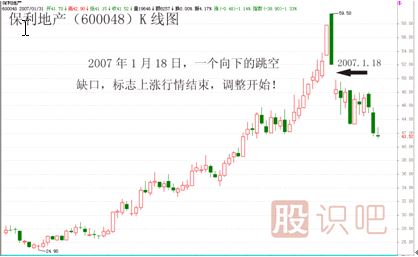 再如600048保利地產(chǎn),在2007年1月18日留下了一個(gè)向下的突破缺口,標(biāo)志著一輪調(diào)整行情的開始。(見下圖)