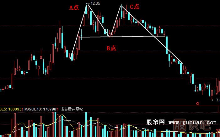 如下圖中體產業(yè)雙重頂形態(tài)出現在日線圖上,該股帶量一波上升之后在A點(12.35元)形成第一個波峰;在股價調整到B點時,成交量明顯萎縮;從B點起,成交量略有放大,股價上升到C點形成第二個波峰,隨后一波下跌,直接跌破頸線。