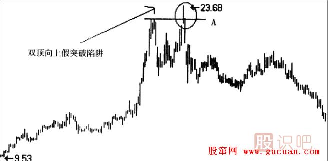 在雙頂中,我們會遇到第二波峰高于第一波峰的情形:市場價格在作第二次沖鋒使,竟然越過了第一個峰位的阻力,但就在市場正預期它會將上升趨勢進行到底的時候,趨勢卻出現意料地發(fā)生了逆轉,造成第二峰的高度與第一峰的高度不相等,且第二峰高過第一峰。這就是我們常說的“多頭陷阱”。這種多頭陷阱常常出現在中國股市的一些著名莊股中。