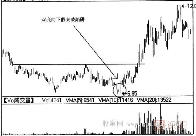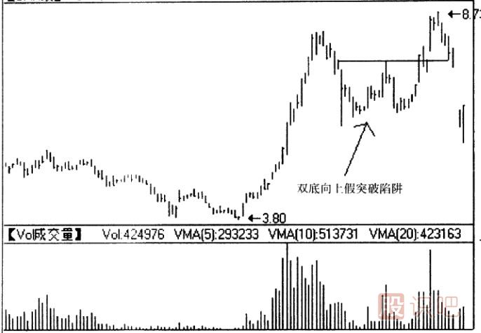 在雙底形態(tài)形成過(guò)程中,股價(jià)未構(gòu)成對(duì)頸線的有效突破,就可能形成雙底陷阱。通常,雙底陷阱有兩種類(lèi)型: