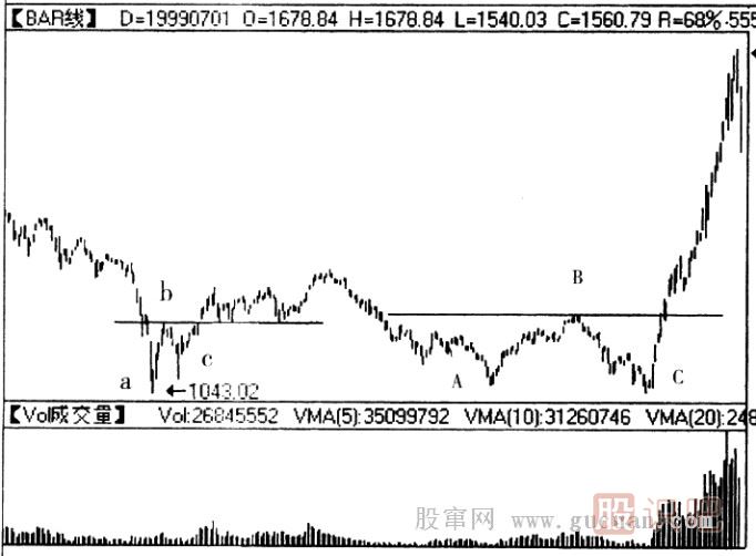 (2)有兩個(gè)波谷,最低點(diǎn)基本處于同一水平線上,因酷似英文字母W,又名W底。雙底是底部反轉(zhuǎn)形態(tài)之一,是股價(jià)見(jiàn)底回升的信號(hào)。投資者見(jiàn)到該種形態(tài),應(yīng)選擇好買(mǎi)點(diǎn)(一般在股價(jià)突破頸線回抽后放量上攻時(shí))適當(dāng)買(mǎi)進(jìn)該股等待升勢(shì)。走勢(shì)圖中的雙底形態(tài)出現(xiàn)在上證指數(shù)的日線圖上,圖中出現(xiàn)兩個(gè)雙底的轉(zhuǎn)勢(shì)形態(tài)。在前一個(gè)較小規(guī)模的雙重底形態(tài)中,先是指數(shù)放量創(chuàng)出1043.02這一近幾年新低,然后又急劇反彈至b點(diǎn);指數(shù)從b點(diǎn)又開(kāi)始下跌,成交量有所減少,說(shuō)明市場(chǎng)殺跌動(dòng)能已經(jīng)減弱。從圖中我們可以發(fā)現(xiàn),c點(diǎn)明顯高于a點(diǎn),當(dāng)市場(chǎng)帶量突破b點(diǎn)時(shí),雙底反轉(zhuǎn)形態(tài)完成。在之后的走勢(shì)重,市場(chǎng)極弱,創(chuàng)下一個(gè)谷底A,隨后放量上升到B點(diǎn),從B點(diǎn)開(kāi)始的下跌甚至跌破了前一谷底A達(dá)到C點(diǎn)。此外我們看到在第二個(gè)雙底形態(tài)中,第二個(gè)波谷要比第一個(gè)波谷低,這與通常的情況是相背離的,我們可以用“空頭陷阱”來(lái)解釋。此后,股價(jià)從C點(diǎn)出發(fā),開(kāi)始一輪井噴式的上漲行情力,上證指數(shù)創(chuàng)出一波歷史新高。
