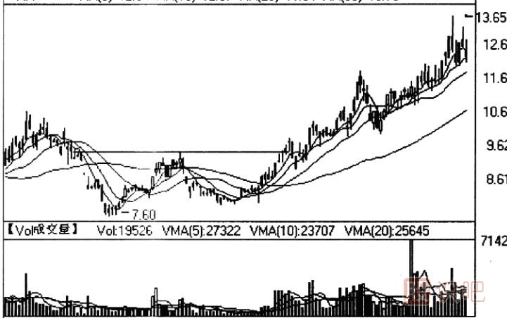 案例2:如圖方框內(nèi)的形態(tài)叫做雙底,雙底是底部反轉(zhuǎn)形態(tài)之一,是股價(jià)見(jiàn)底回升的信號(hào),投資者見(jiàn)到雙底形態(tài),應(yīng)判斷出該股后市看好,可適當(dāng)介入做多。如圖中的雙底形態(tài)出現(xiàn)后,股價(jià)開(kāi)始一輪較大的上漲行情,從7.60元的低位至13.65元的高價(jià),升幅近80%。