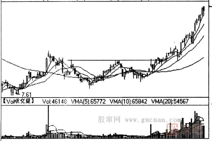 案例3:如圖方框內(nèi)的形態(tài)叫做雙底,它是底部反轉(zhuǎn)形態(tài)之一,投資者見(jiàn)到雙底形態(tài),應(yīng)判斷出股價(jià)底部形成在即,建倉(cāng)的好機(jī)會(huì)就在眼前,因而投資者可適當(dāng)買(mǎi)進(jìn)該股待漲。在圖1中雙底形態(tài)中,股價(jià)在突破頸線后基本上是一路上揚(yáng),沒(méi)有回抽,投資者宜在股價(jià)突破頸線后及時(shí)建倉(cāng)。