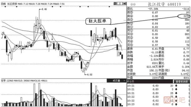 比如長江投資3270手委托單是圖中顯示委托單的平均5?6倍左右(如圖3-14所示),因此這筆單子就是一筆大單,它的存在對股價后期的波動將會有重要的影響!在股價上漲的途中,如果在股價上方出現(xiàn)較大的委托賣單,股價運行到此處不放量吃掉這筆大賣單,股價往往就會停止上漲;有的時候甚至還沒有漲到大賣單的價位處股價便停止了上漲。如果股價在此時想漲上去,一是放量吃掉大賣單,再就是這筆大賣單主動撤掉。