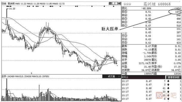 圖3-5為葛洲壩(600068)在2011年11月24日的盤面情況。我們看到圖中箭頭所指之處,掛出了一個1473手的大單,給人帶來強大的壓力,持股人擔(dān)心股價仍然會下跌,可能會就此賣出,而持幣者則可能就此看空,持觀望態(tài)度。
