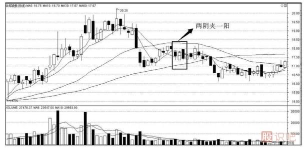 (3) 兩陰夾一陽出現(xiàn)在跌勢中,繼續(xù)看跌。此時多方的力量已經(jīng)十分微弱,下跌途中雖有反抗,但卻改變不了下跌的大局。