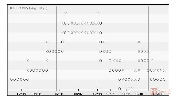 在我們使用的看盤圖表中,常見的技術(shù)圖表主要包括K線圖、柱狀圖、收盤價(jià)線圖、點(diǎn)數(shù)圖。據(jù)考證,股市交易者最早使用的是點(diǎn)數(shù)圖技術(shù)。維克托·德維利爾斯在1933年出版的《點(diǎn)數(shù)圖預(yù)測股價(jià)方法》一書中首次提及點(diǎn)數(shù)圖。點(diǎn)數(shù)圖中"X"形狀組成的列表示價(jià)格上升,"O"形狀組成的列表示價(jià)格下降。只需要用到最高價(jià)、最低價(jià)就可以畫出點(diǎn)數(shù)圖,如圖1-1所示。但是現(xiàn)在很少有人使用這一圖表,且很多看盤軟件不再提供這種看圖方法。