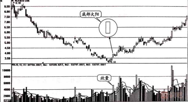 底部大陽是指在股價(jià)經(jīng)過了長期或大幅度的下跌后,在低位形成止跌企穩(wěn)的走勢,某天突然收出一根實(shí)體極大的陽線,成交量明顯放大,表明買方氣勢旺盛,力量強(qiáng)大,此時(shí)是投資者買入的良機(jī),如圖1-1所示。接下來由股識(shí)吧來簡談單根K線底部大陽買入,不清楚的難怪遲遲不發(fā)財(cái)。
