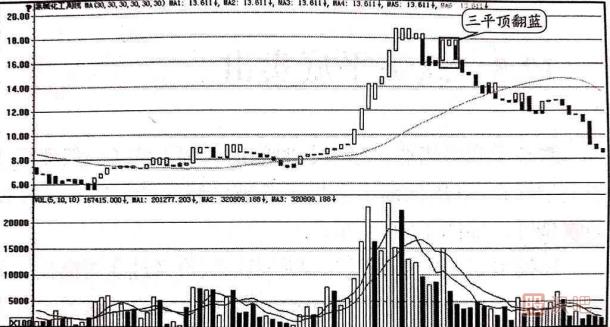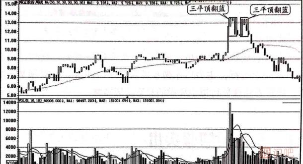 三平頂翻藍(lán)是指在周K線中,當(dāng)股價(jià)經(jīng)過(guò)一段時(shí)間的上漲(一般漲幅要求超過(guò)50%)后,寶塔線在30周均線上方出現(xiàn)第一次或者第二次的三平頂翻藍(lán),即在連續(xù)的三根周K線中,最后一周的收盤(pán)價(jià)向下跌破了第二周的收盤(pán)價(jià),如圖1-7所示。接下來(lái)由股識(shí)吧來(lái)給妳說(shuō)寶塔線指標(biāo)三平頂翻藍(lán)賣出,由小編來(lái)為大伙兒剖析一下。