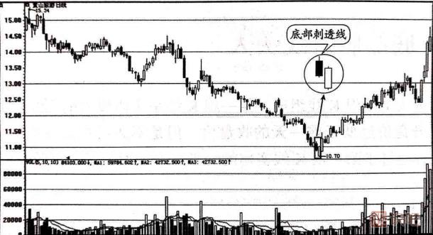 底部刺透線由兩根K線組成,第一根K線是實(shí)體較大的陰線,第二根K線跳空低開,開盤價遠(yuǎn)低于前一天的收盤價,但是不久后在買盤的推動下價格回升并且收盤價超過了第一根K線實(shí)體的一半以上,形成了一根低開高走的陽線,如圖1-3所示。接下來由股識吧來解釋多根K線底部刺透線買入,皇天不負(fù)有心人,看完下文終于讓你知道。