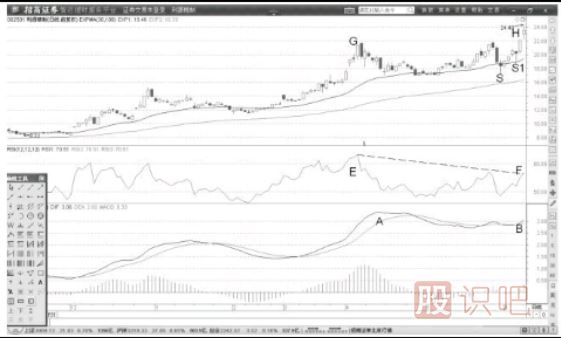 1.從股價(jià)高位見頂回落來看:如圖5-7所示,該股從8元啟動(dòng)以后,股價(jià)飆升至G位置的20元以上,漲幅高達(dá)150%。這個(gè)時(shí)候股價(jià)創(chuàng)新見頂信號(hào),不用懷疑該股見頂?shù)恼婕?,因?yàn)楣蓛r(jià)漲幅確實(shí)比較高了。投資者可以用指標(biāo)背離來確認(rèn)高拋交易機(jī)會(huì)。