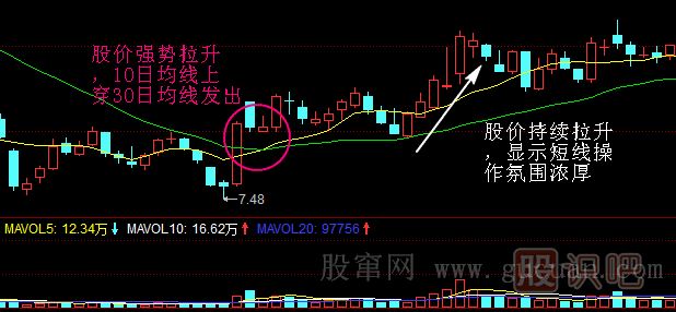1、在股價強勢拉升,且30日均線上穿60日均線形成金叉時,顯示股價持續(xù)上漲的信號,投資者可短線追漲。