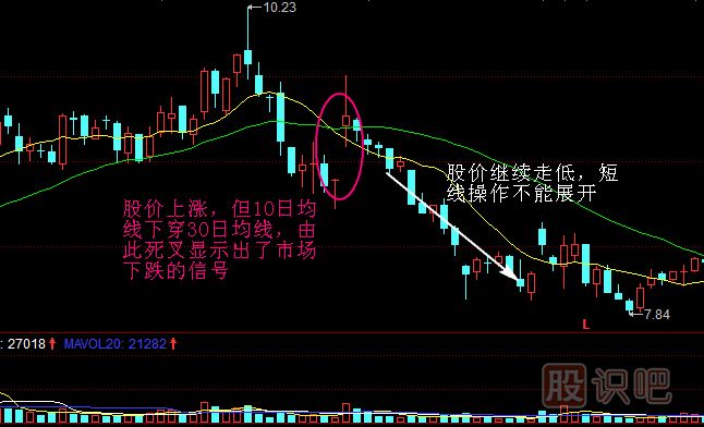 如上圖所示,該股在橢圓區(qū)域出現(xiàn)了較大幅度的單日反彈,但是死叉依舊存在,從10日均線下穿30日均線可知,該反彈無法成功扭轉走勢中的整體下跌局面。