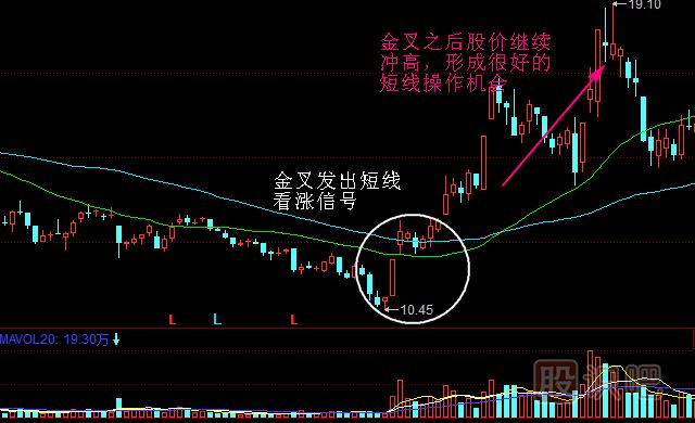 如上圖所示,當均線形成金叉之后,股價持續(xù)拉升,這樣的上漲顯示了金叉信號的準確性,短線操盤者若能積極參與其中必能獲利。